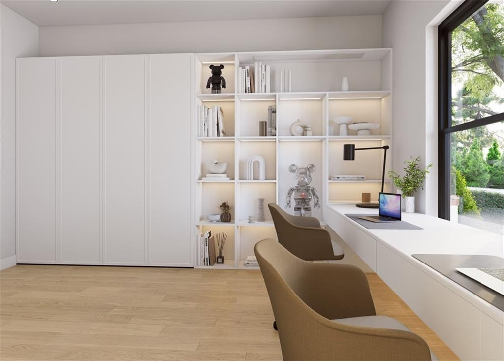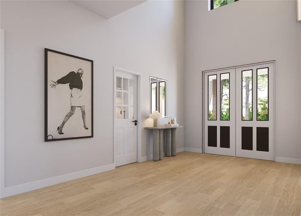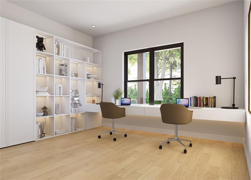 To your right, a private study offers the perfect space for productivity or quiet reflection. Just beyond, a beautifully positioned guest suite on the main level provides comfort and privacy for visitors or multi-generational living.